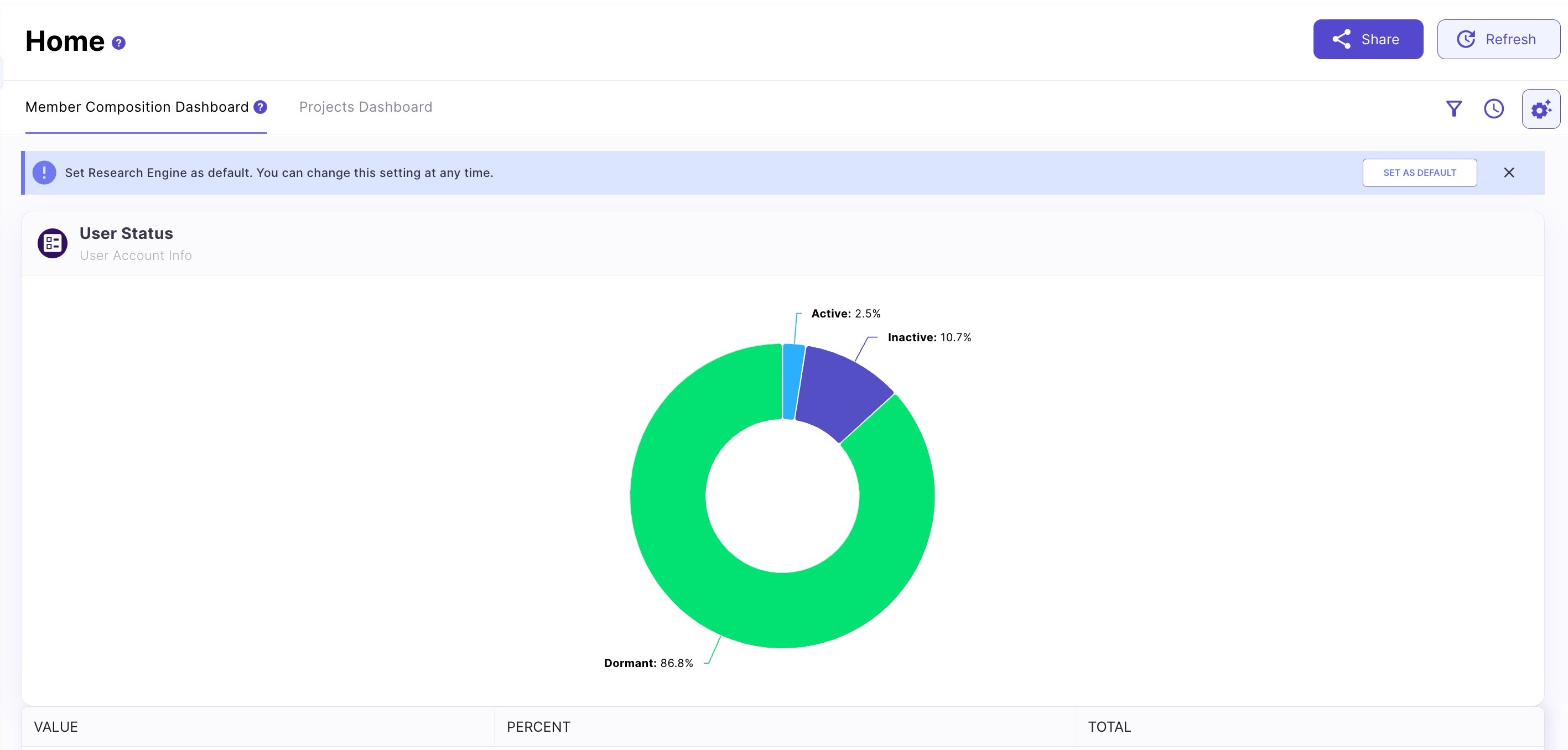 The first 3 dashboards display charts on User Status, Gender (if collected), and Age (if collected). Choose up to 20 more data points from P2 Points and Groups to visualize on the dashboard.