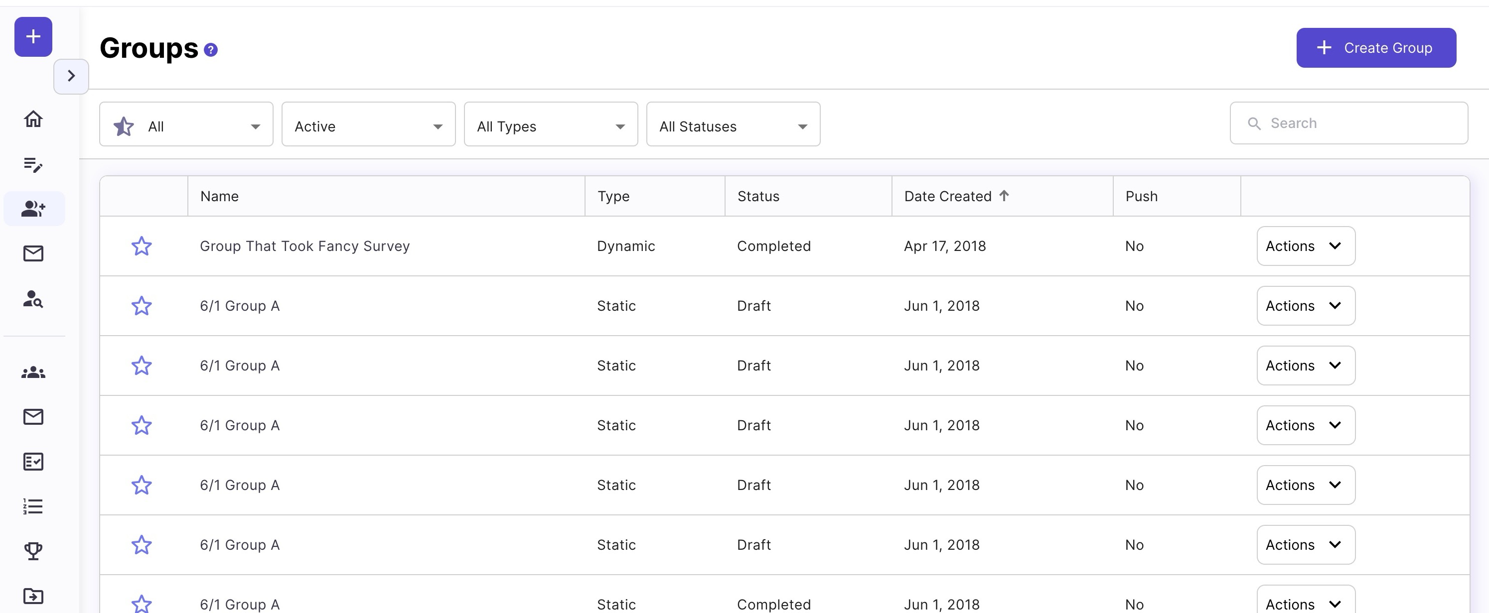 Users can now mark groups as favorites from the Groups List page for easy access to your high-priority audiences. The star icon represents a group’s favorite status. Mark groups as favorites by clicking on the empty star to fill it. To remove the favorite, click the solid star to make it empty.